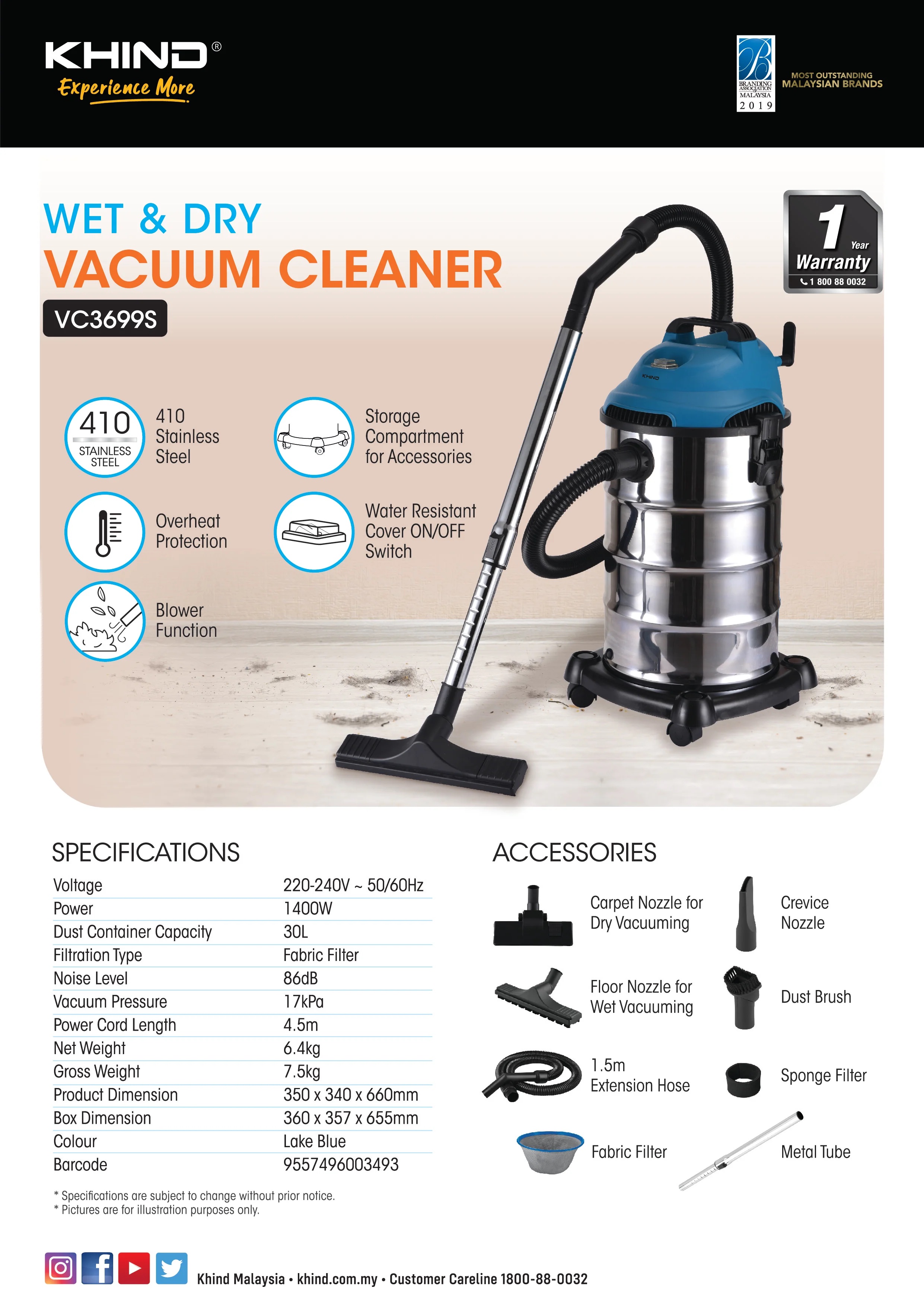 - Backed by a 1-Year Warranty, the KHIND VC3699S is ready to be your ultimate cleaning partner. Explore the specifications and accessories below to see why this is the only vacuum cleaner you'll ever need.